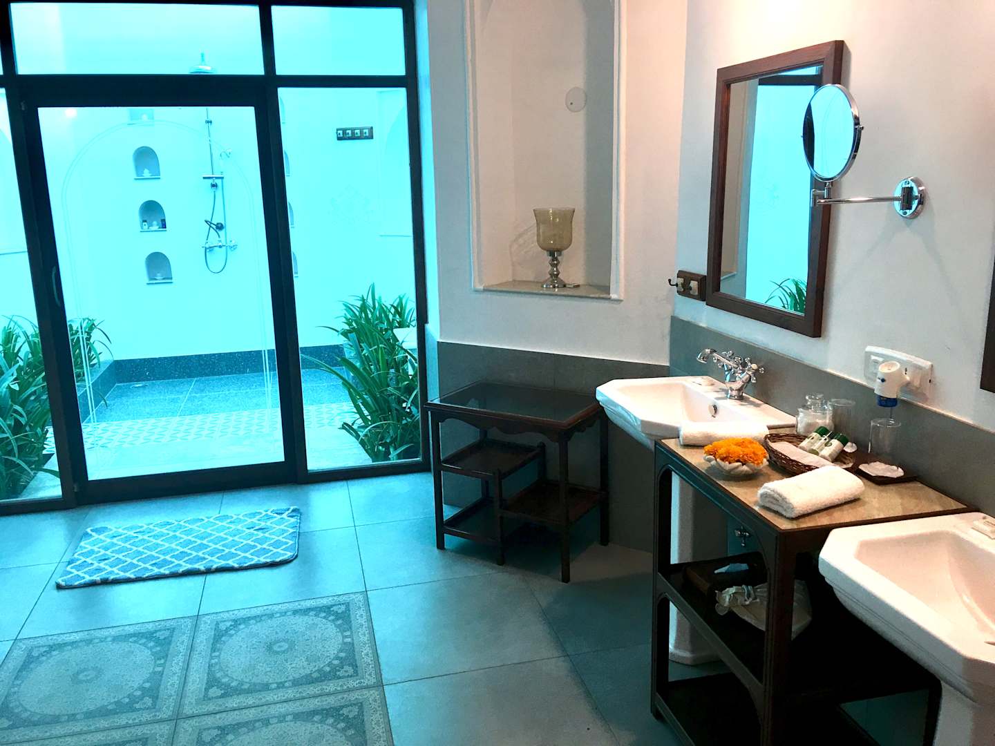 Zimmergroßes Bad mit Innen- und Außendusche