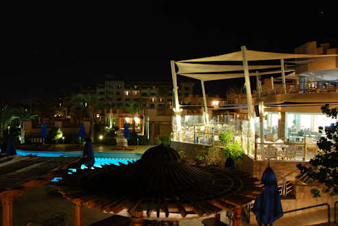Restaurant und Pool am Abend