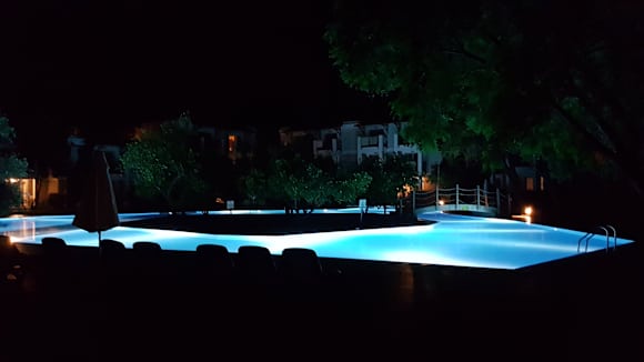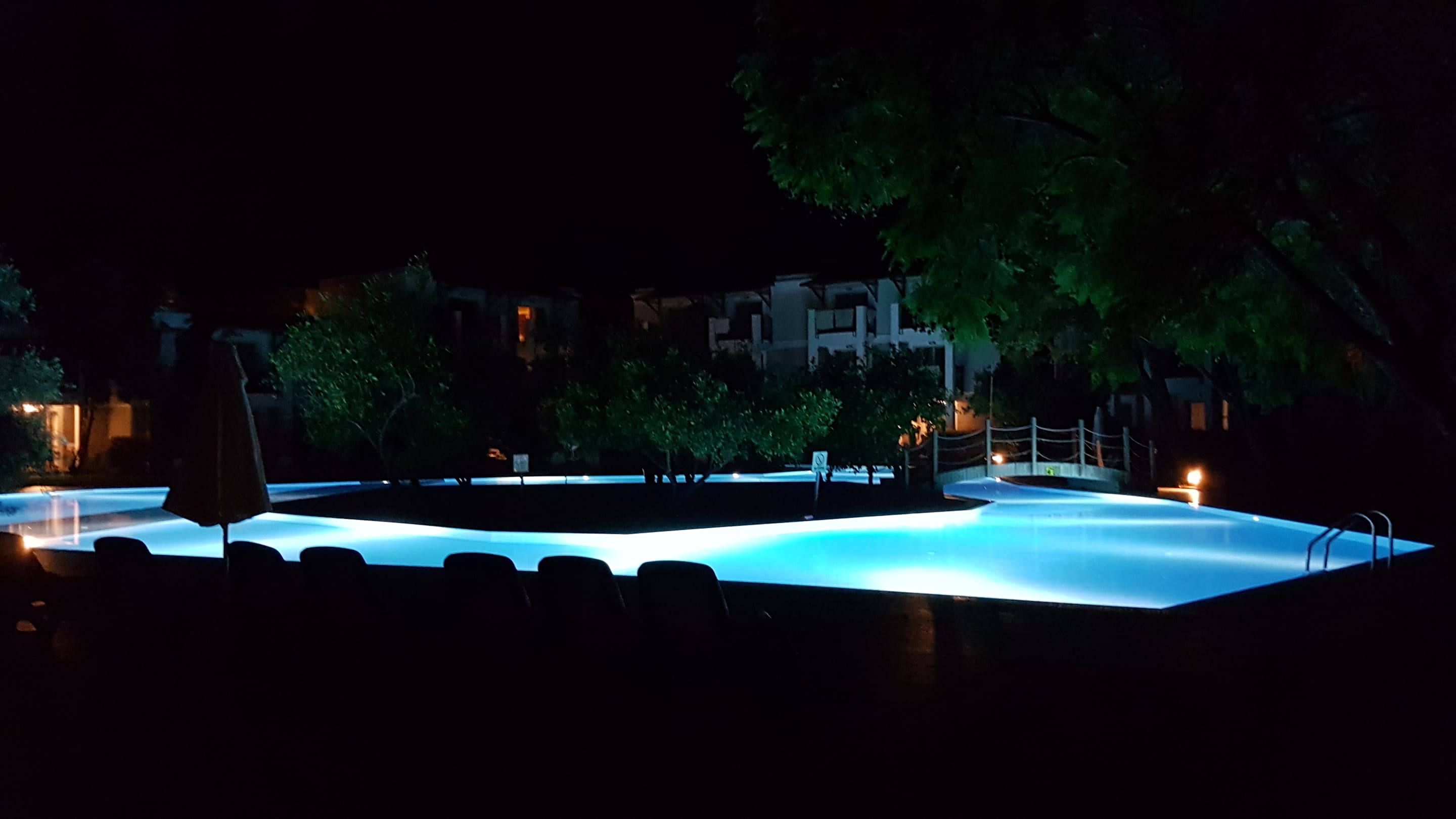 Privater Pool bei Nacht zwischen den Bungalowanlagen.