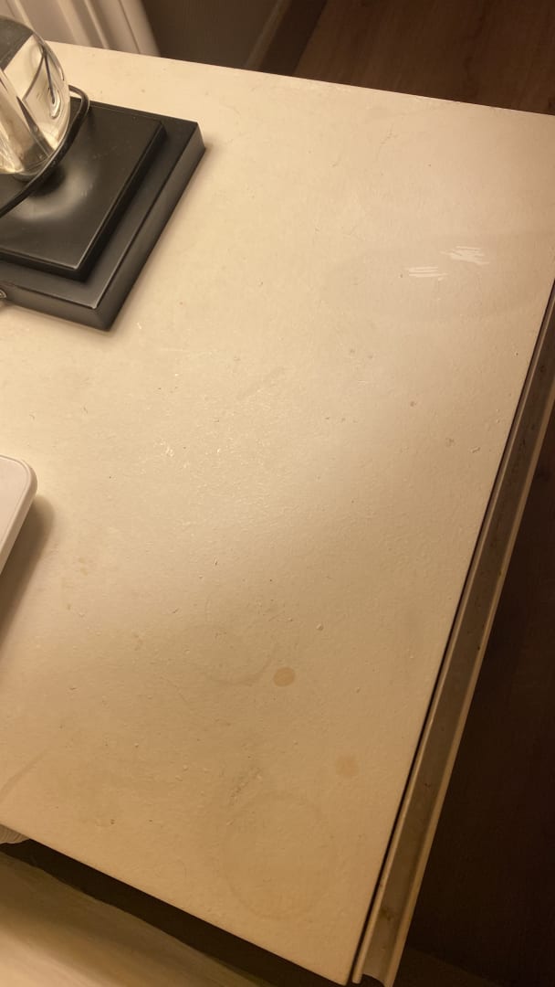 Auf dem Nachttisch Kaffeeflecken, obwohl nicht einmal Kaffee getrunken.