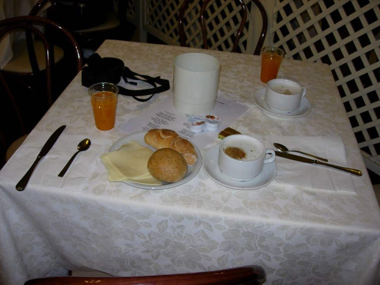 Frühstückzu erkennen die Pizzabrötchen man brauchte schon ein sehr scharfes Messer um sie aufzuschneiden auch die Zähne sollten noch in Ordnung sein.Als alternativ gab es aber auch die runden Brötchen sie waren weich.An dem Tag hatte ich den Multivitaminsaft getrunken. Der Kaffee sah besser aus als er geschmeckt hat.