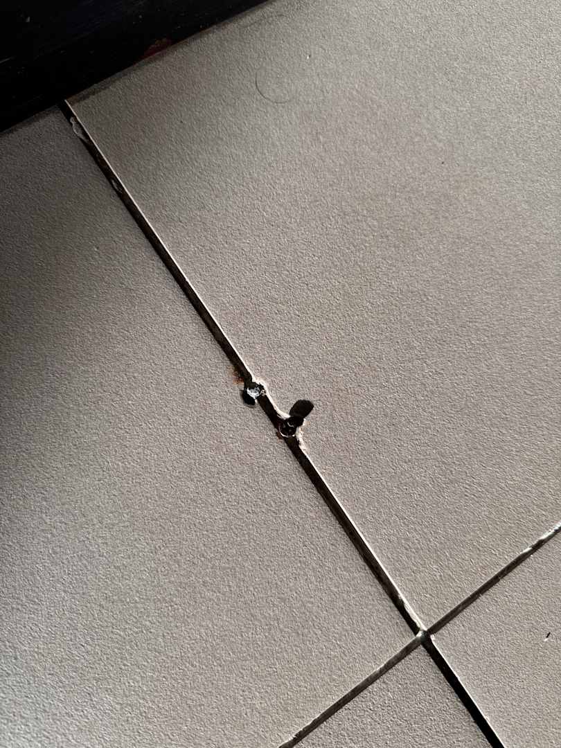 ein rostiger Nagel, der aus der Fliese am Boden ragt neben dem Kleiderschrank