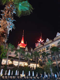 Aussenansicht des Hotels bei Nacht.