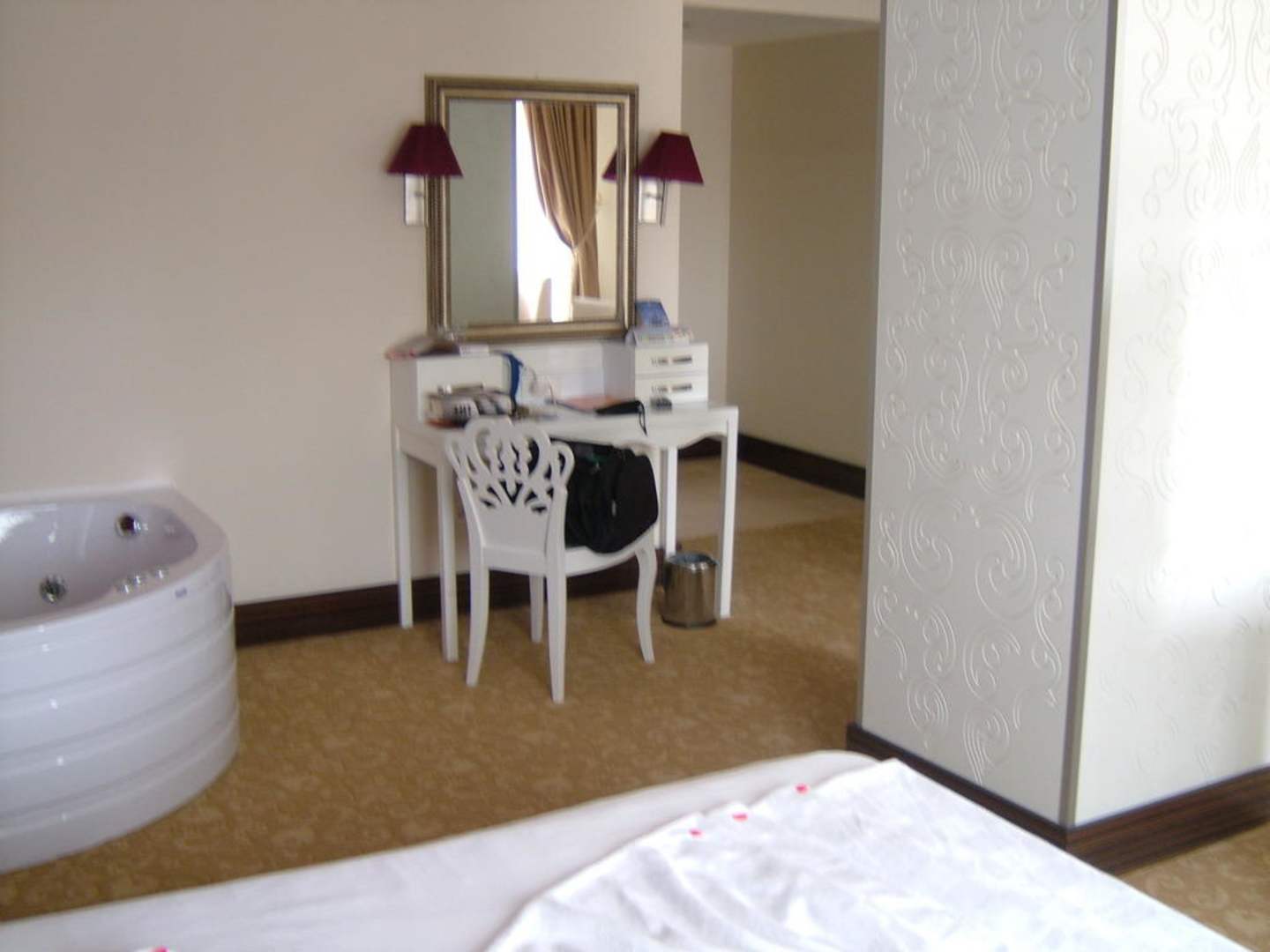 Blick vom Bett auf das Schminktischchen