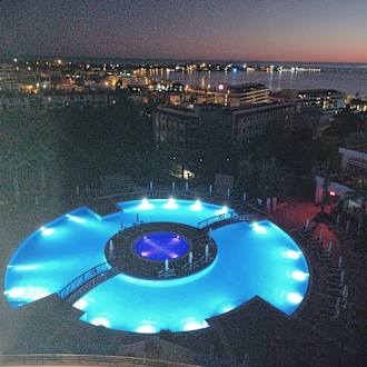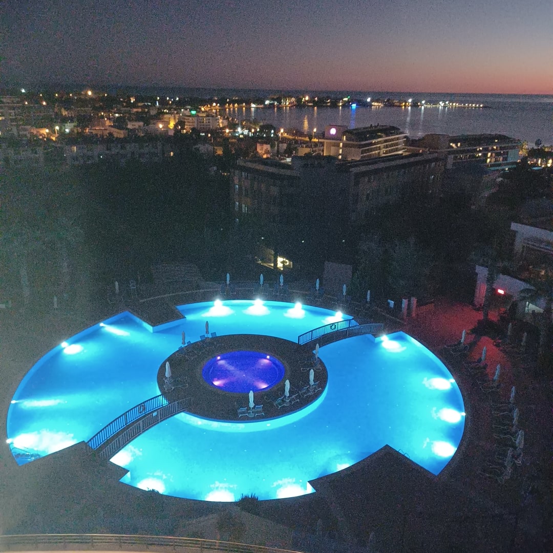 Blick auf Side Altstadt und Pool aus dem 5. OG in der Dämmerung