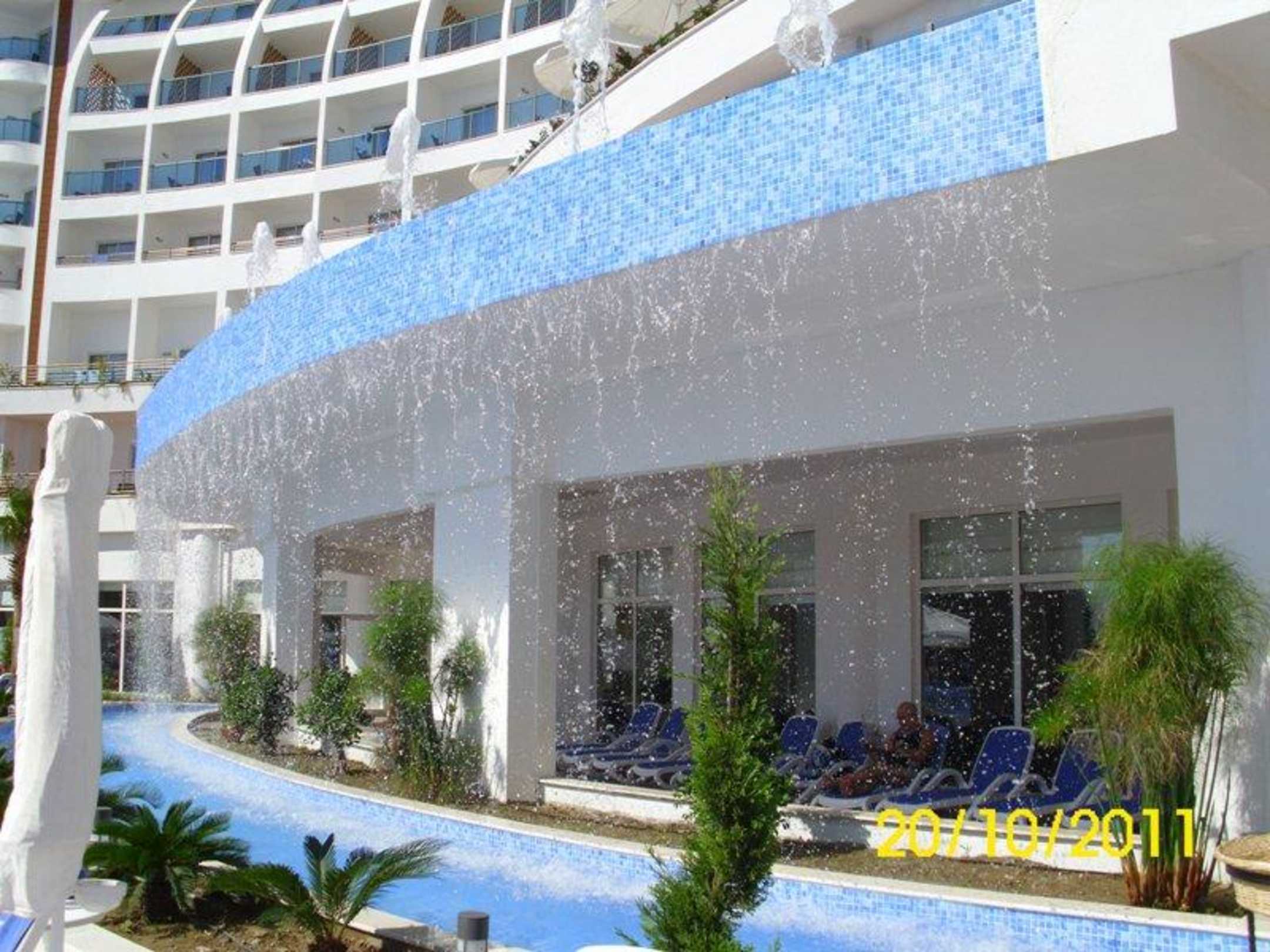Wasserspiel am Pool, in der Nacht beleuchtet mit Farbwechsel