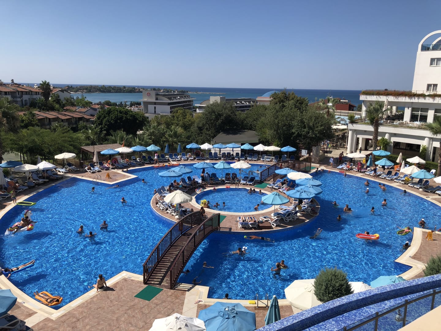 Blick auf den Pool und im Hintergrund schon das Meer