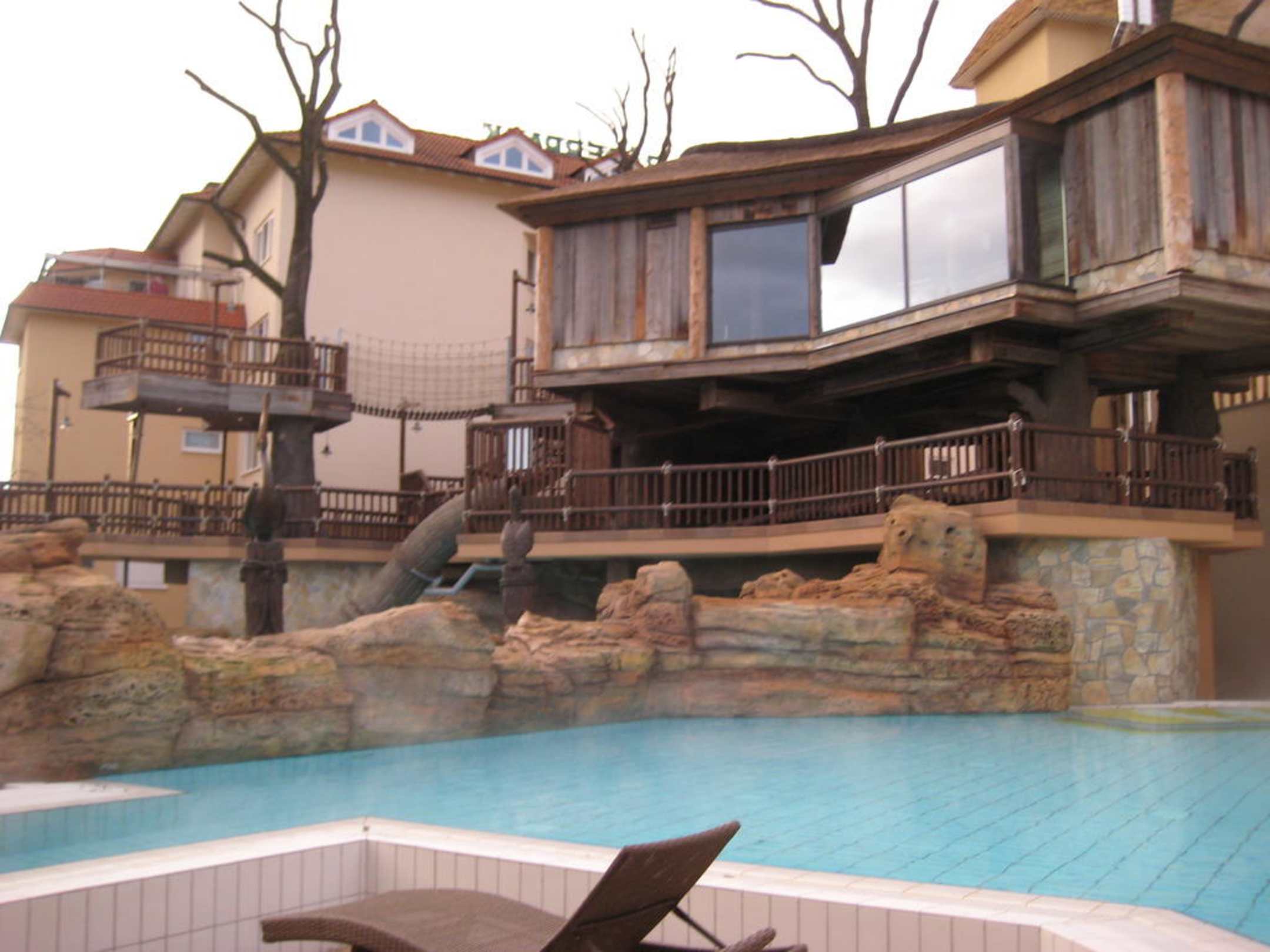 Therme: Bereich Afrika, Baumhaus SaunaDie Baumhaussauna ist eine Textilsauna. Von dort kann man über eine Rutsche in einen Außenpool gelangen.