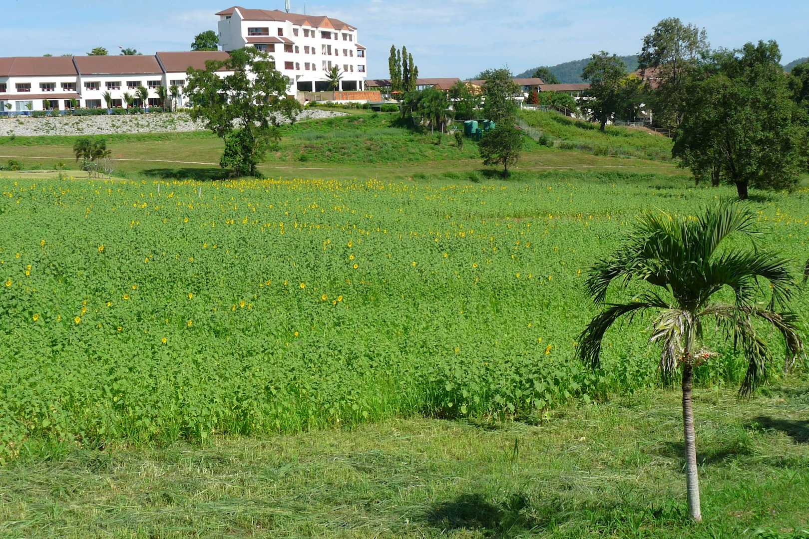 Blick vom Golfplatz auf den Hoteltrakt