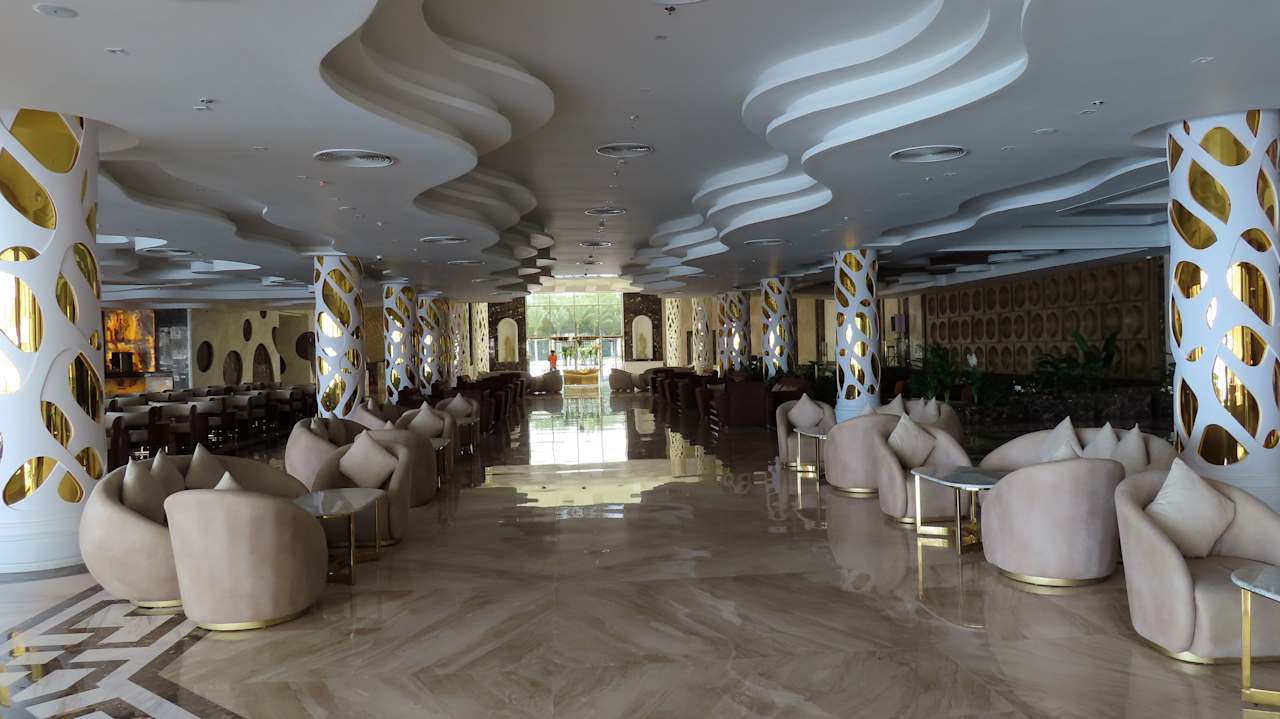 Eingangshalle mit Lobby und trügerischen goldigen Säulen.