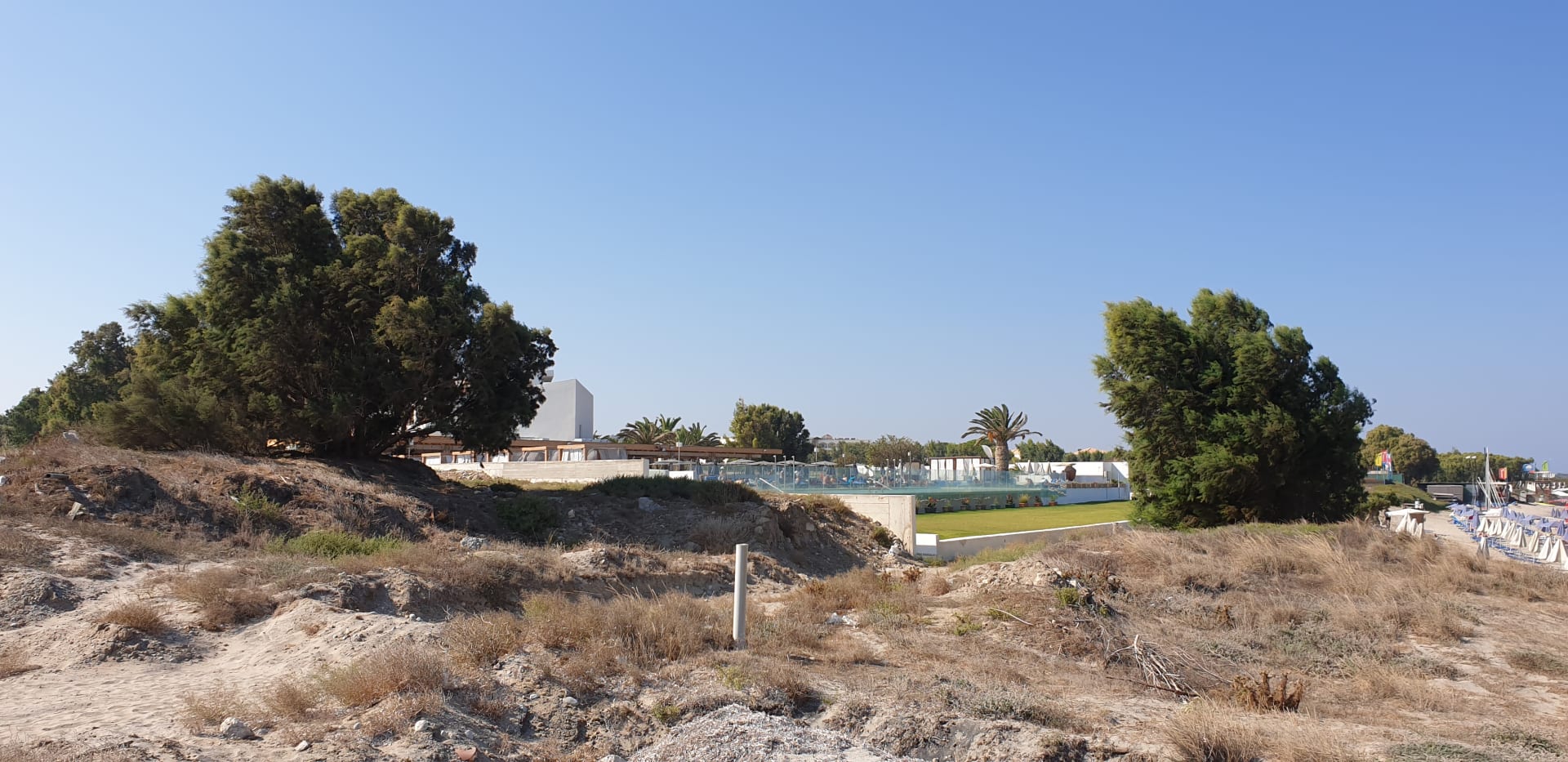 Blick seitlich vom Strand zum Infinitypool