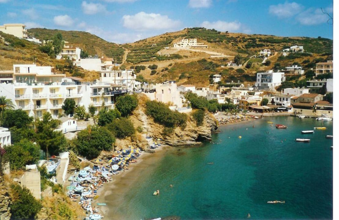 Blick auf das Hotel Sofia Mythos Beach mit seinem Privatstrand und dem Hafen von Bali