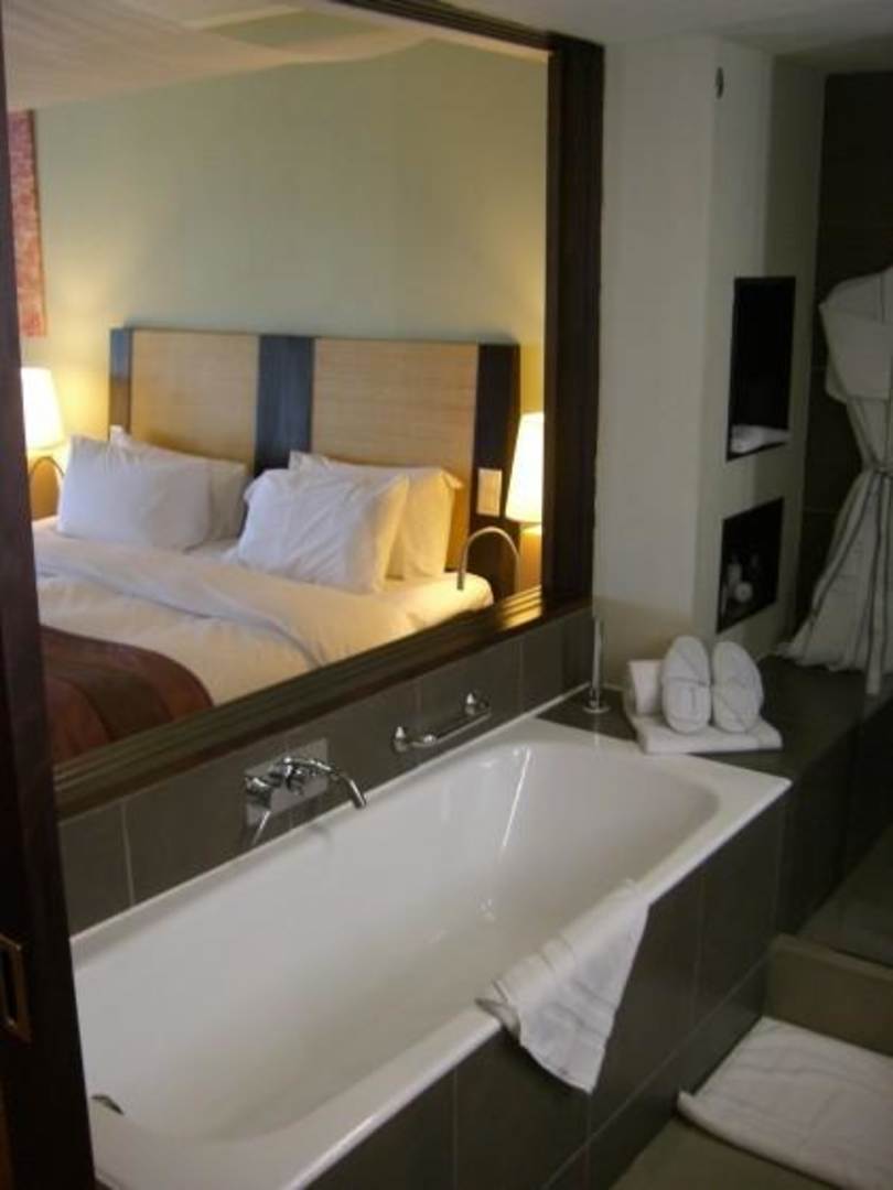 Blick vom Bad auf das King Size Bett