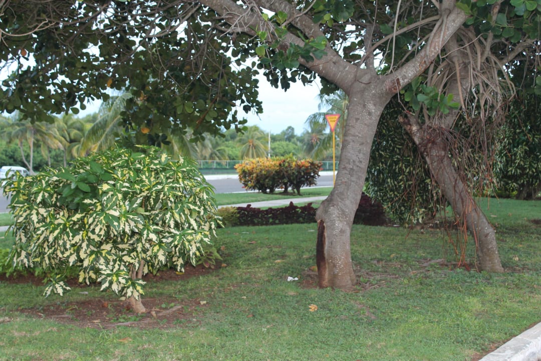 Der Garten mit viele Palmen und Blumen