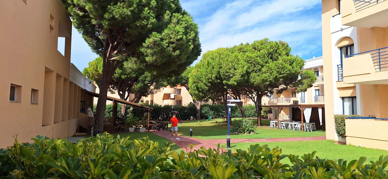 GartenanlageBlick in die Anlage, links Terrasse des Restaurants, auf den ersten (sonnigen) Blick ganz nett