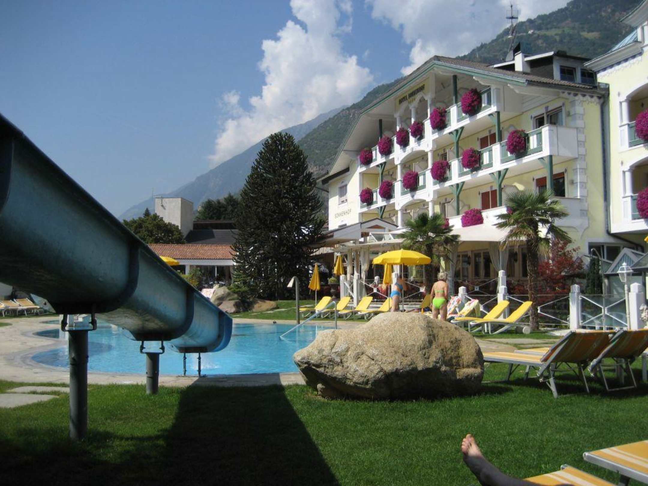 Hotel SonnenhofGartenanlage mit Pool und Wasserrutschbahn für die Kinder. Rechts (nicht im Bild) der hoteleigene Tennisplatz.