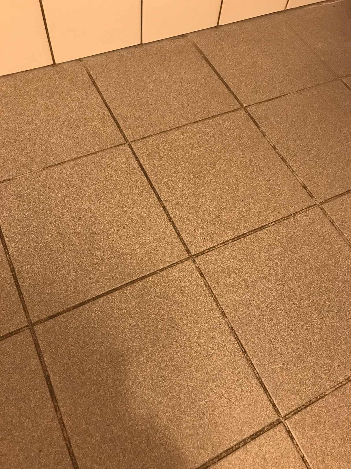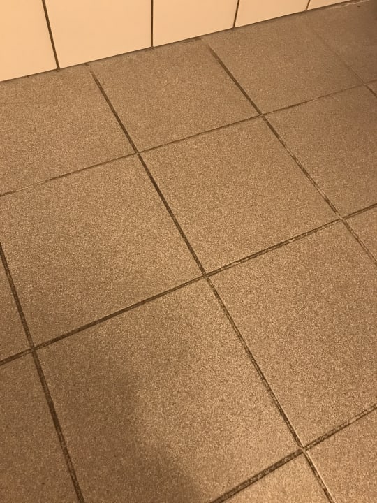Badezimmer-Boden klebt vor Dreck. Täglich wird der Dreck vom Zimmerservice neu verteilt.