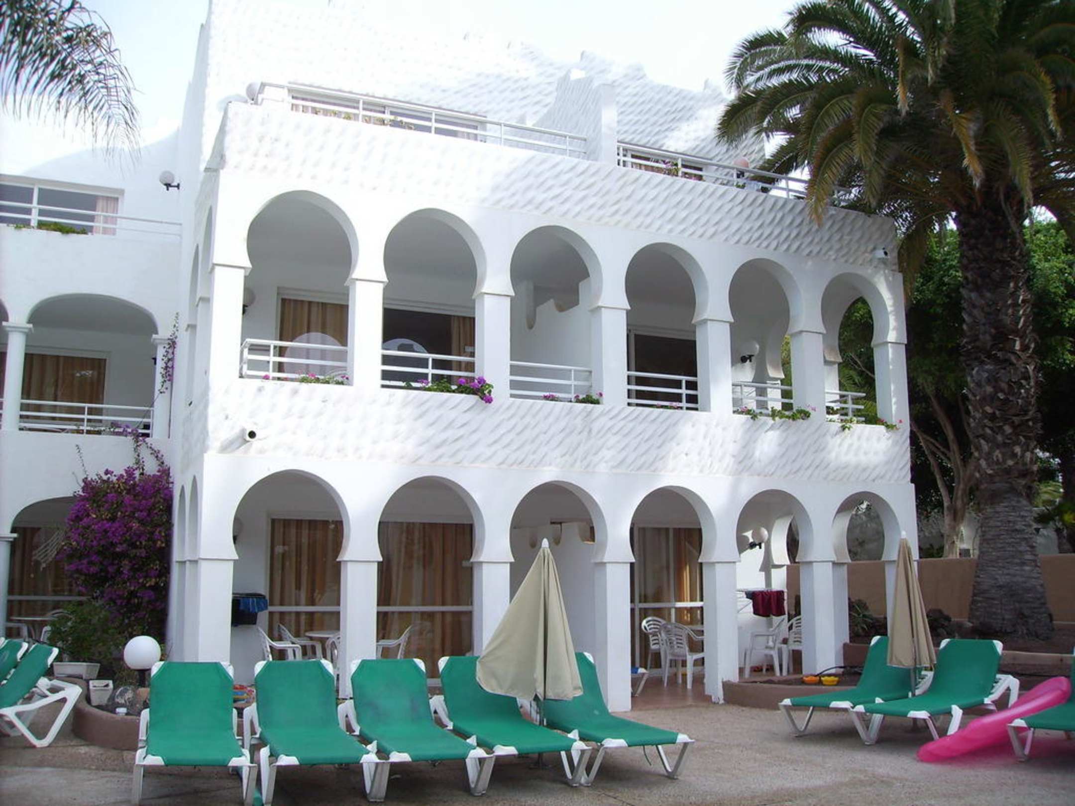 Eines der Wohnhäuser im maurischen Baustil errichtet und weiß gestrichen. Hier eines der Gebäude in Richtung zum Animationspool.