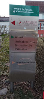 Hinweisschild für Hotel und Klinik