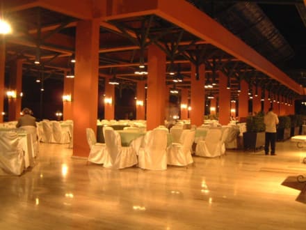 Restaurant; überdacht, offen zu Außenbereich und Pool.