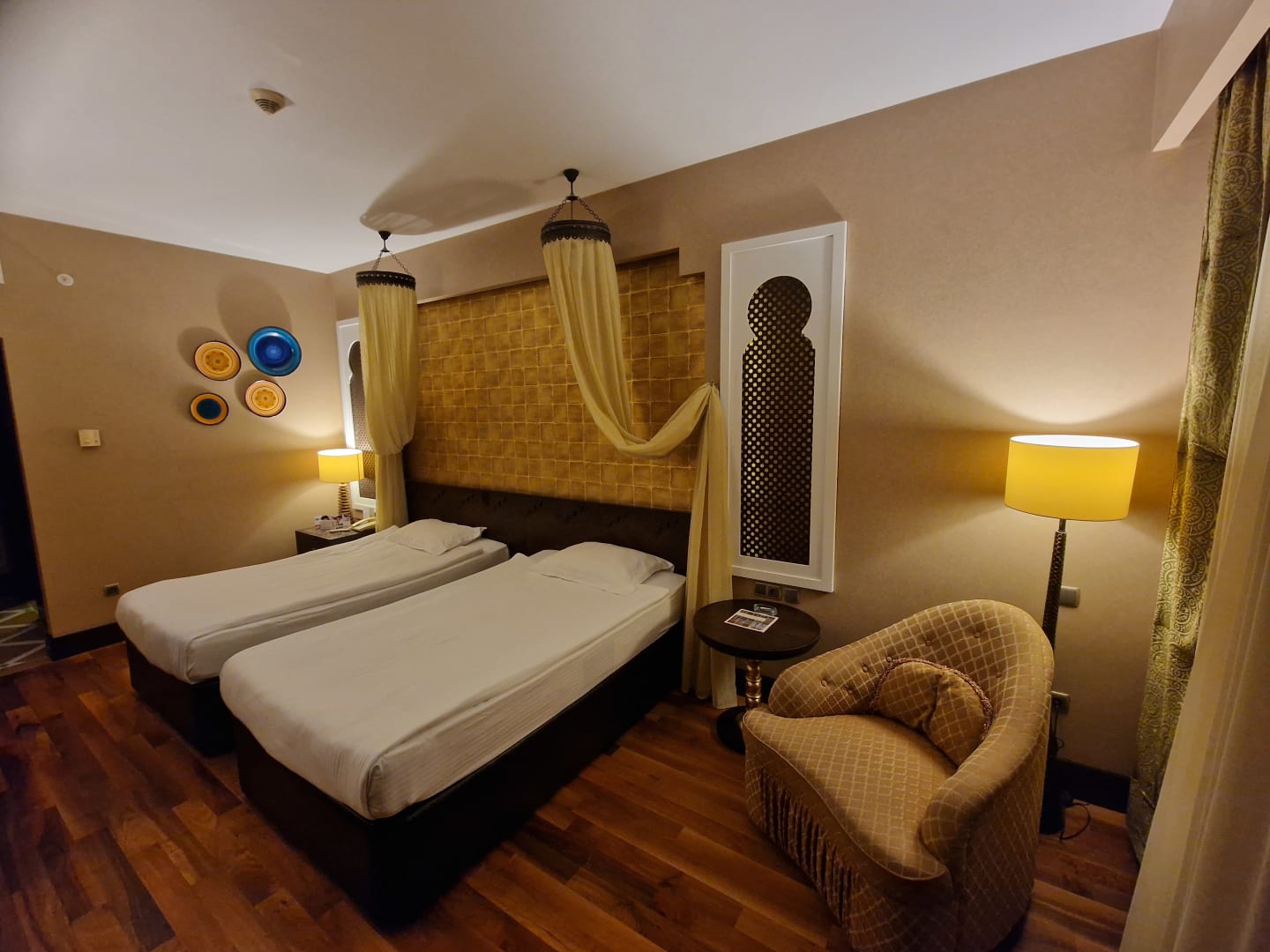 Schöne Zimmer, Betten sind nicht durchgelesen, Bad komfortable und schöne Ausstattung, schöne Mosaiksteine zieren due Wände, alles da, shampoo, Feile, Rasierer etc...Wasser schön warm