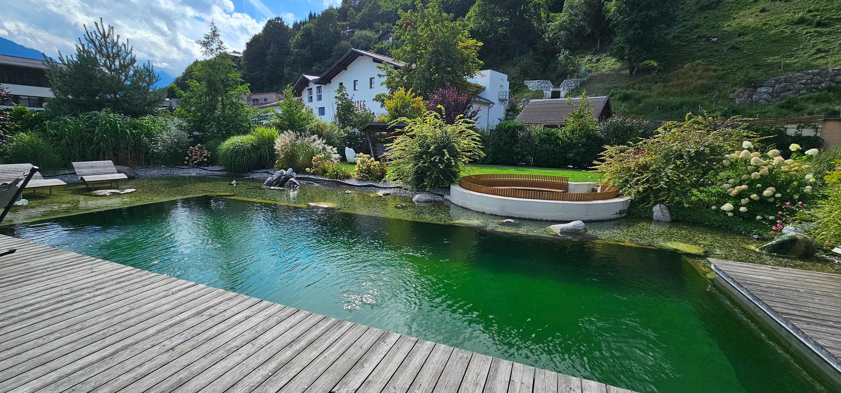 Der Außen-Naturteich - einfach toll und erfrischend nach einem ausgiebigen Wandertag. Hier bestellt man seine Pool-Getränke, wenn man möchte, direkt am Handy.