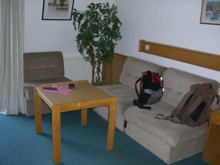 WohnzimmerSowohl im Wohnzimmer als auch im Schlafzimmer befand sich ein (kleiner) TV Apparat. In dem Appartement gab es auch ein Zusatzbett.