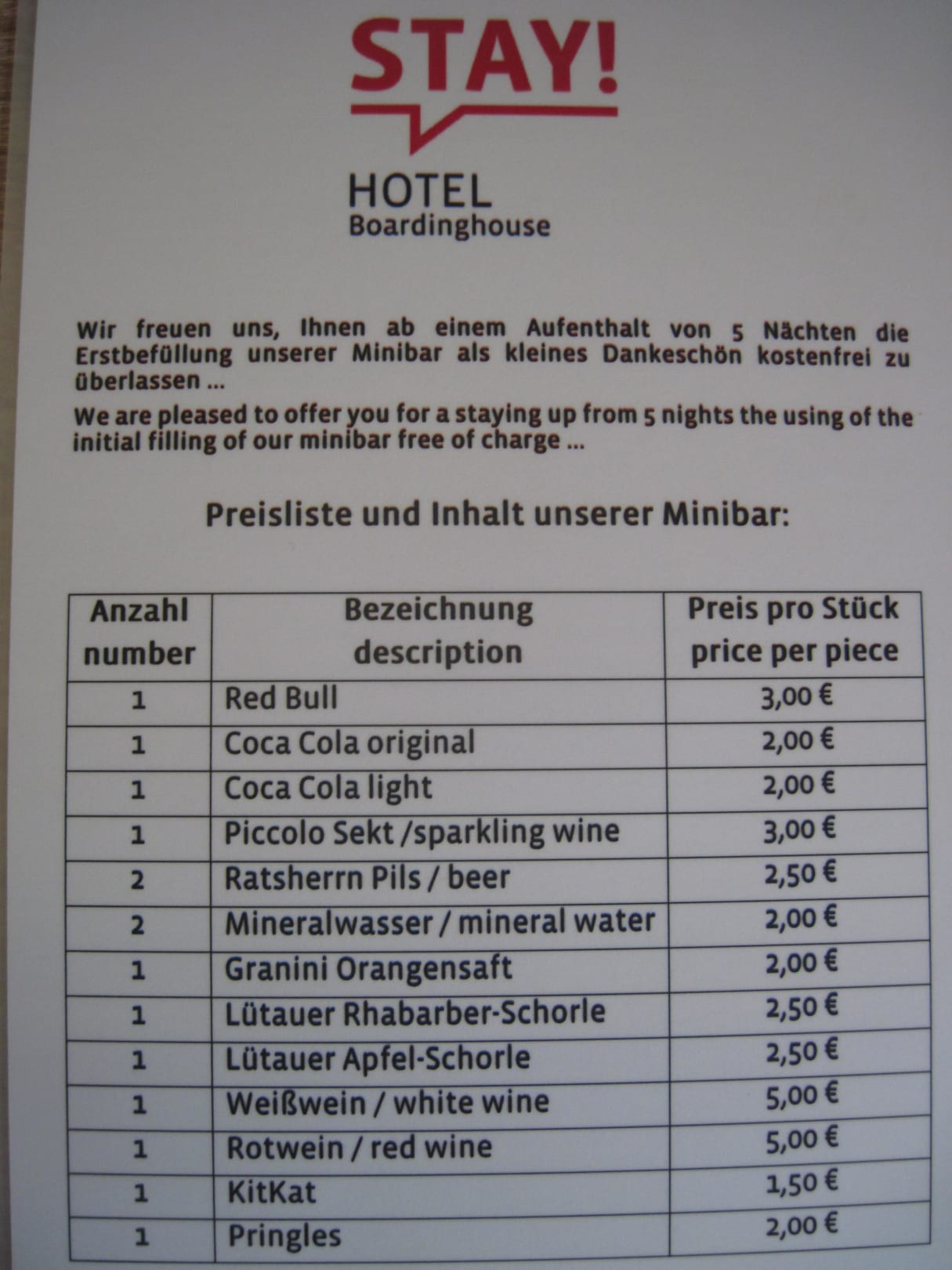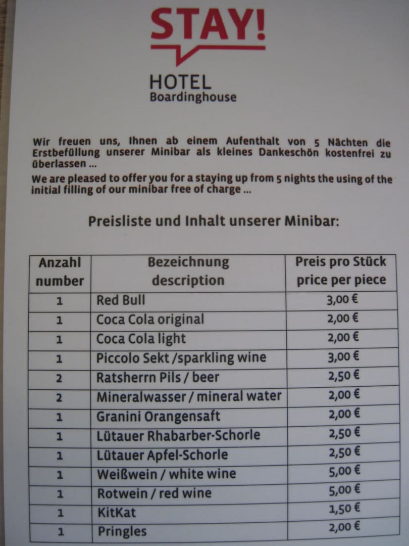 Minibar Preisliste