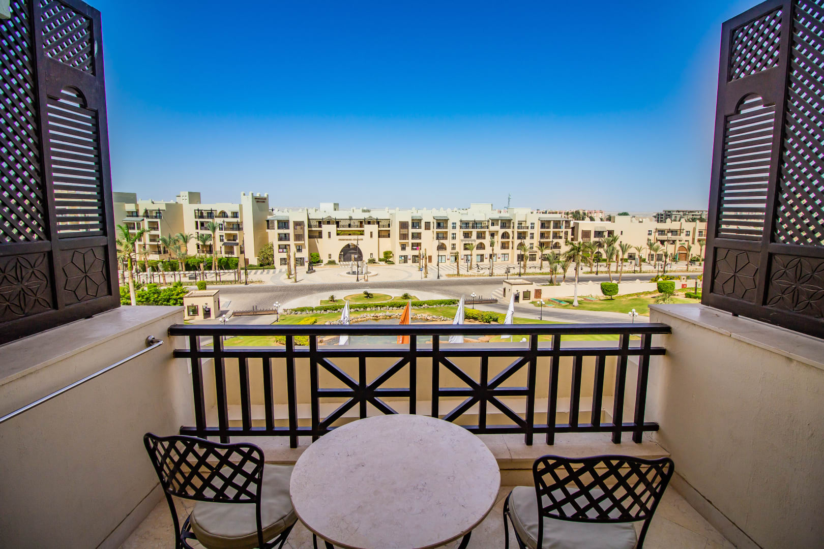 AusblickBalkon-Blick auf das Steigenberger Aqua Magic, normalerweise auch mit Blick auf das Gebirge (wenn es weniger diesig ist)
