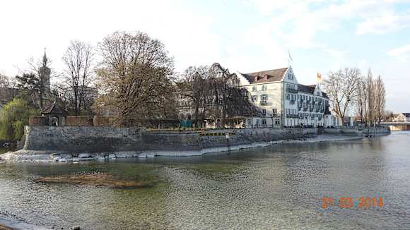 Hinten rechts beginnt der Rheinfluss und -brücke Steigenberger Inselhotel