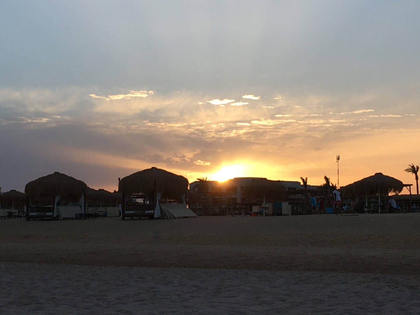 StrandEiner von 2 schönen Sonnenuntergängen am Strand. Ansonsten war es diesig, wohl weil zu viel Sand in der Luft.