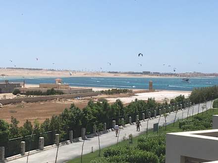 Ausblick vom Ostbalkon im 2. Stock auf die Kiter in der Bucht