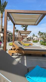 Neue moderne Sonnenliegen. Täglich gibt es neue Handtücher.
