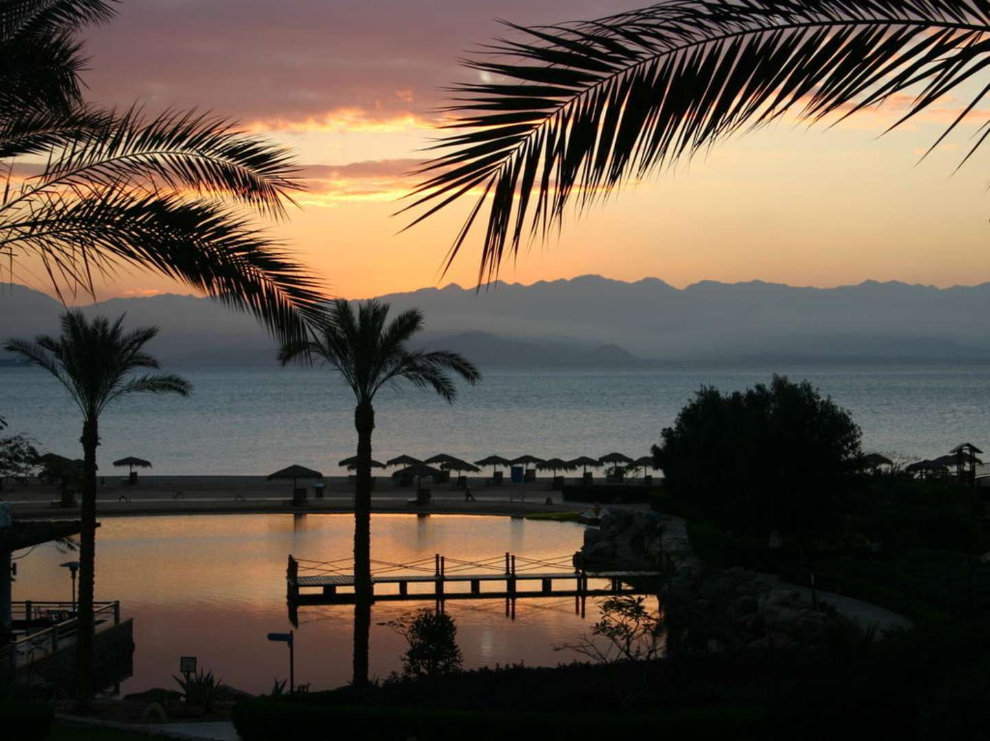 6.05 Uhr morgens, aus der Hotelanlage Sicht auf die Lagune des Hotels Intercontinental auf den Strand, das Rote Meer und das gegenüber liegende Ufer Jordaniens.