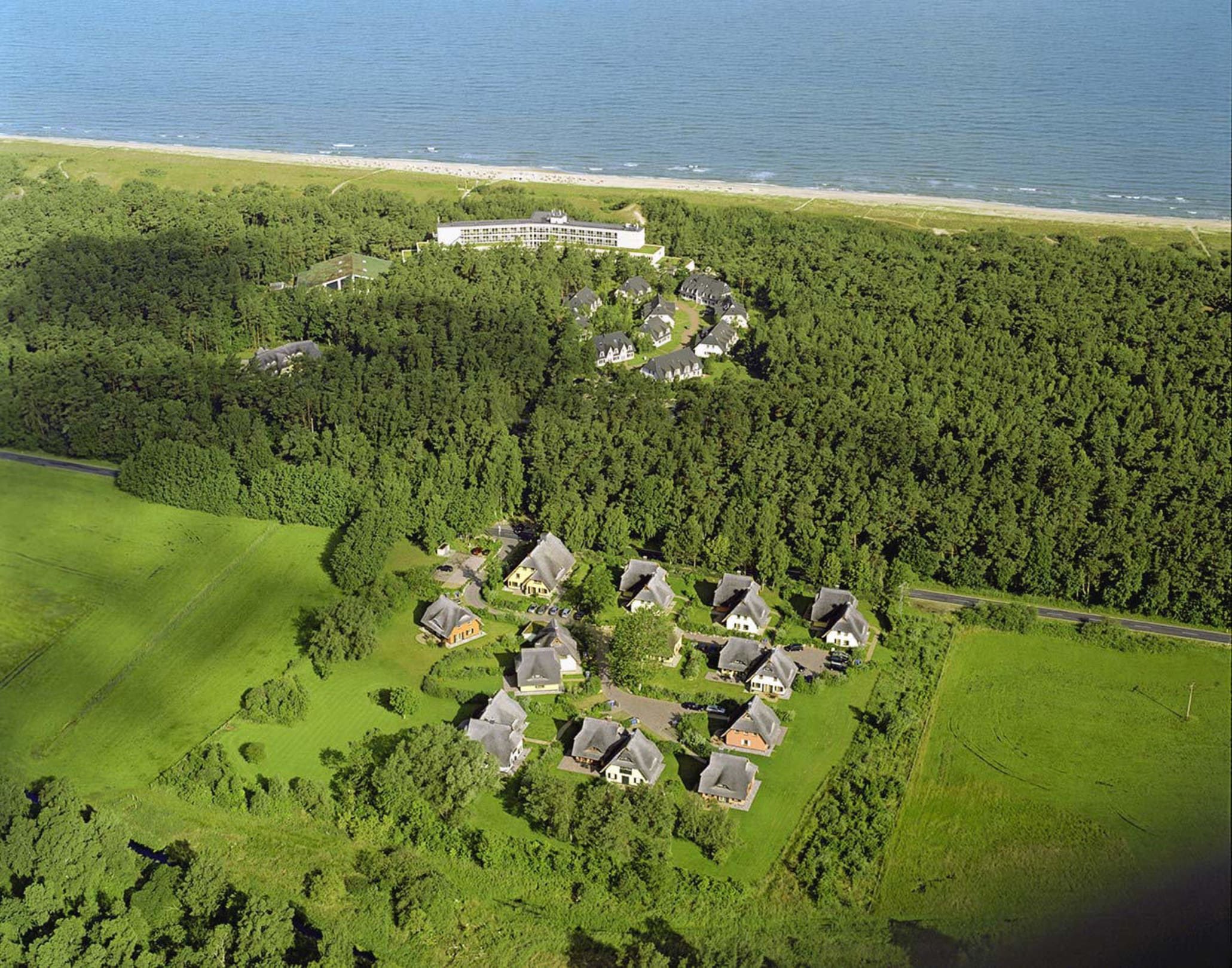 Luftbild vom Hotel und den Ferienwohnungen