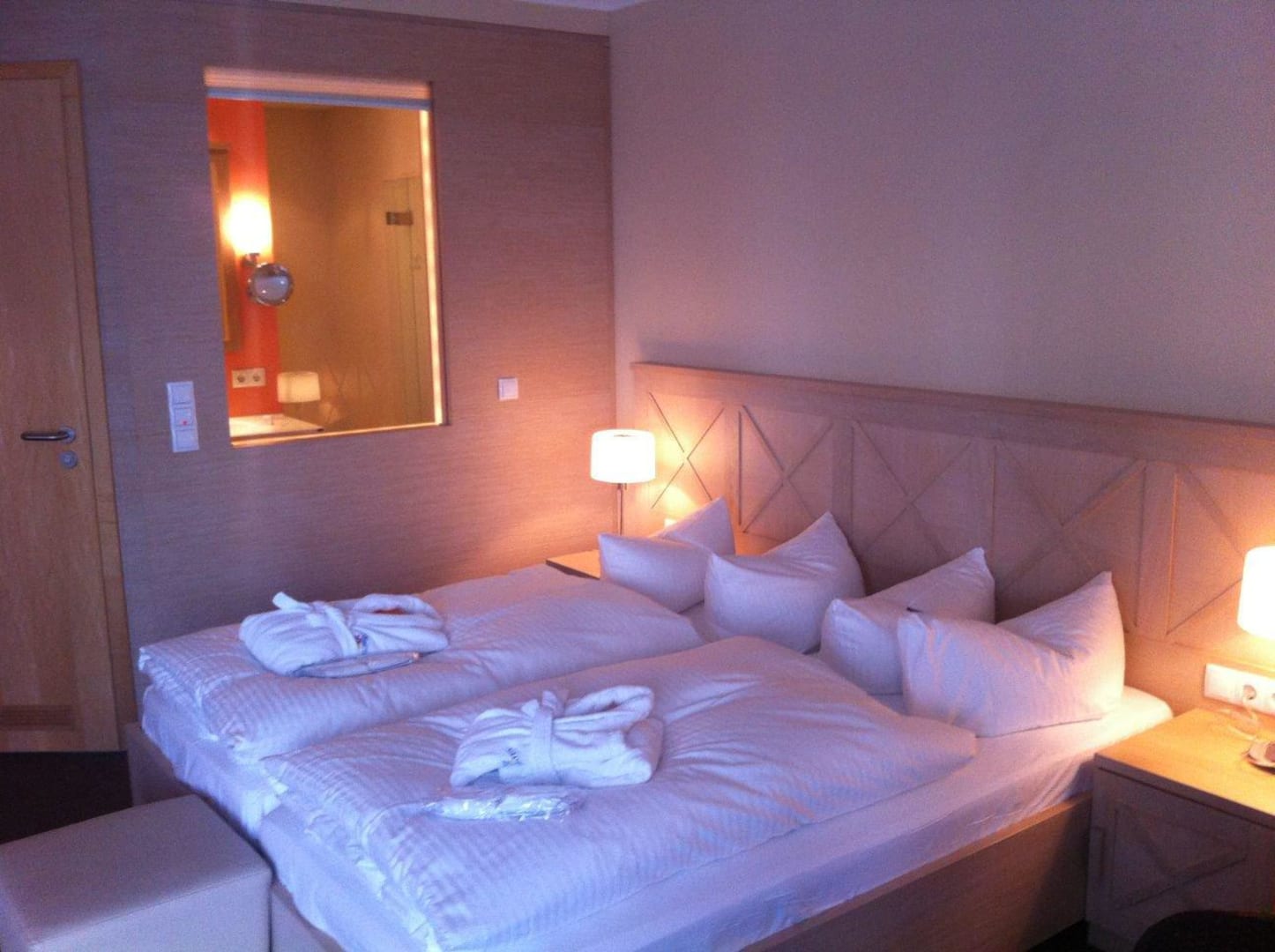 Ein gemütliches und sauberes Zimmer mit Blick ins Bad.