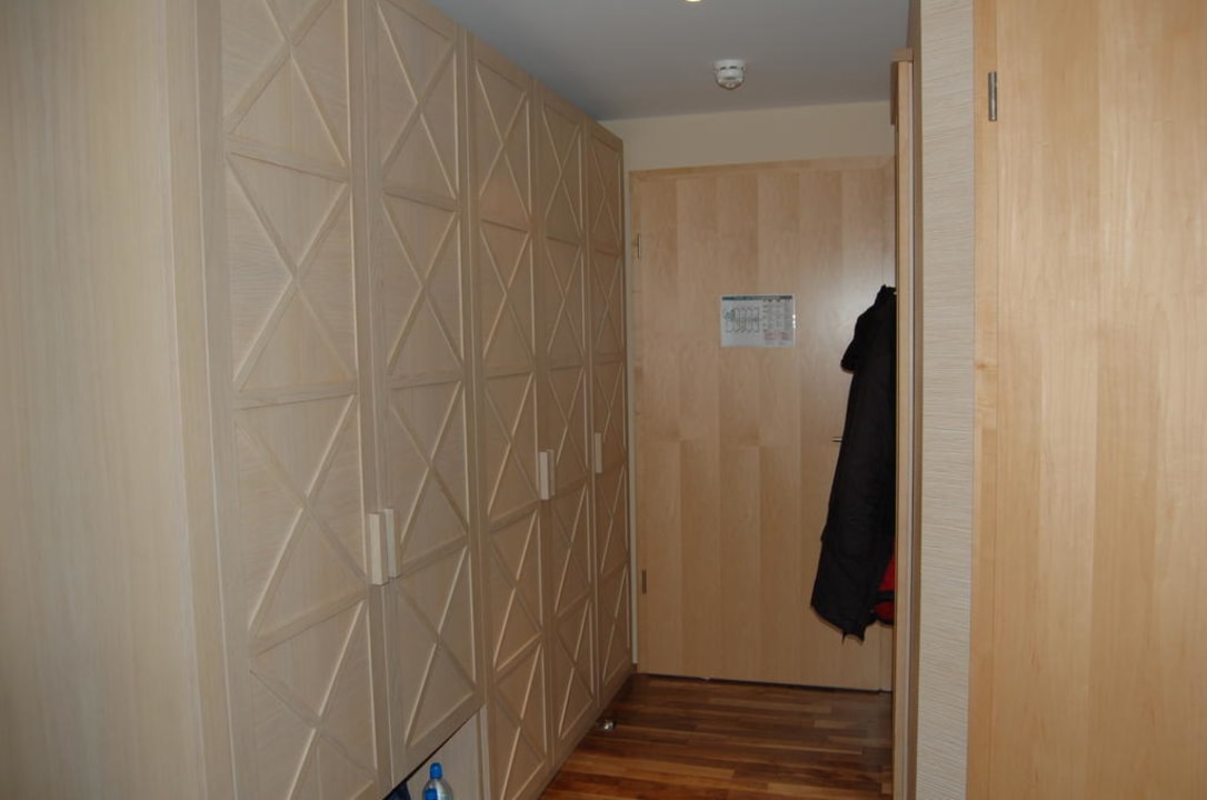 Hier zu sehen der Eingang zum Hotelzimmer und link,s die Einbauschränke