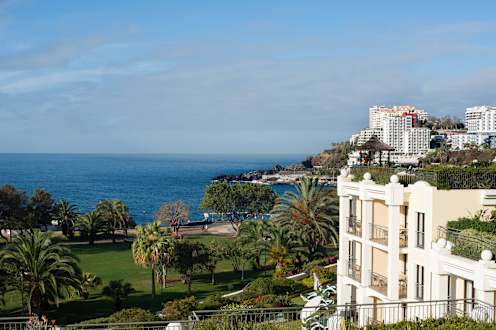 Blick von der Gartenanlage aufs Meer