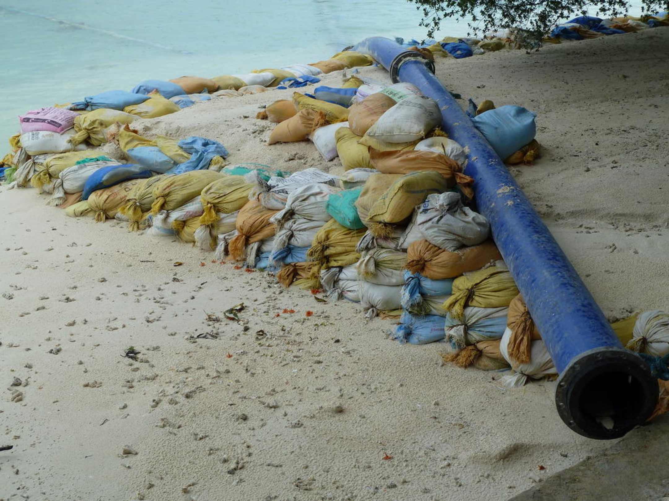 Sand wird angespült und mit Sandsäcken gesichert