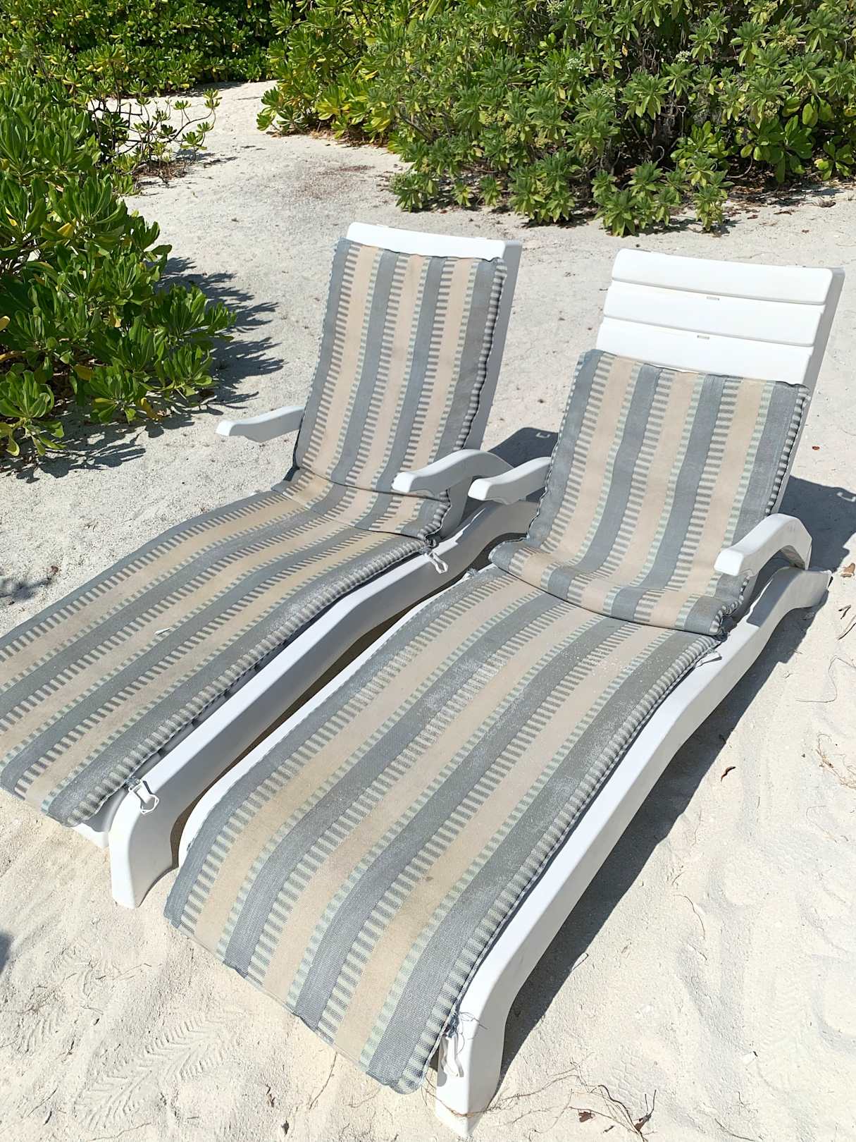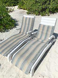 Alte, heruntergekommene und unhygienische Liegepolster. Sonnenschirme gibt es keine.