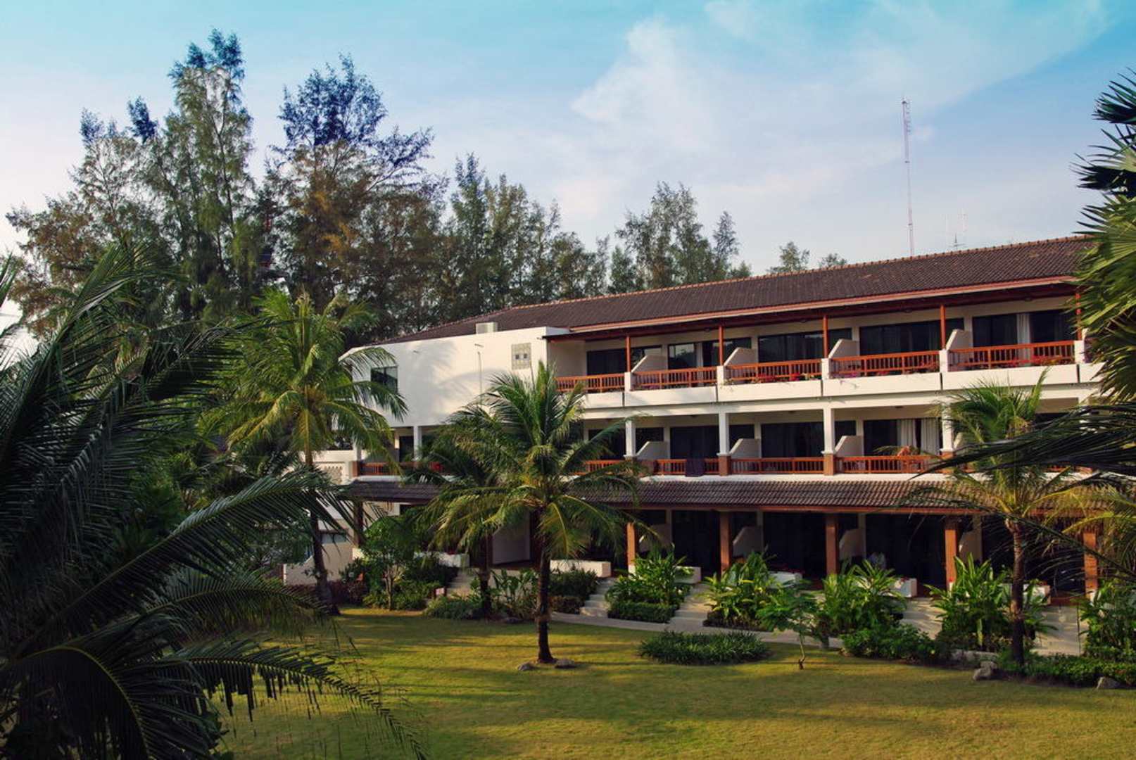 Älterer Hotelteil im AbendlichtZimmerkategorien hier: Deluxe Ground Terrace (unterstes Stockwerk) und Deluxe (darüber).