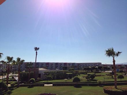 Blick vom Hotelzimmer aus auf die Gartenanlage