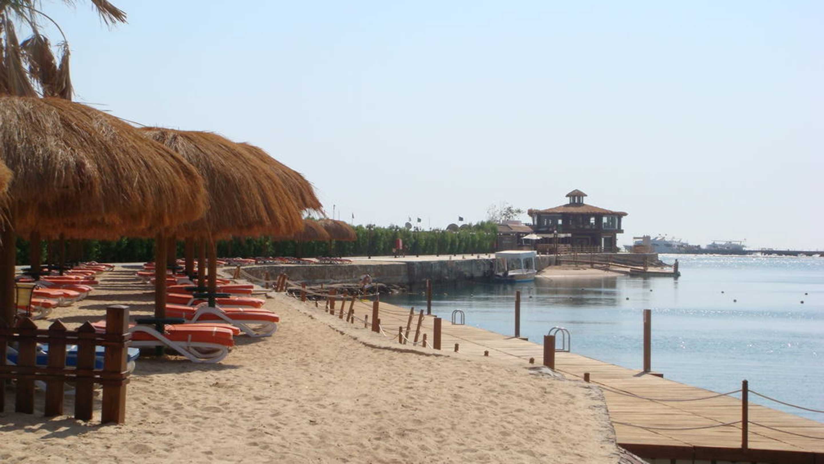 Пляж, вид на пирс и морской ресторан