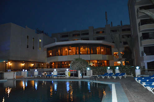Pool bei Nacht mit den bei den Hauptrestaurants
