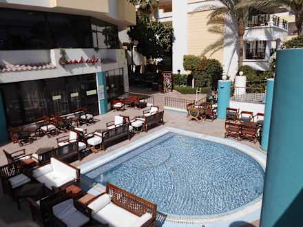 Blick von Poolanlage auf Grand Cafe