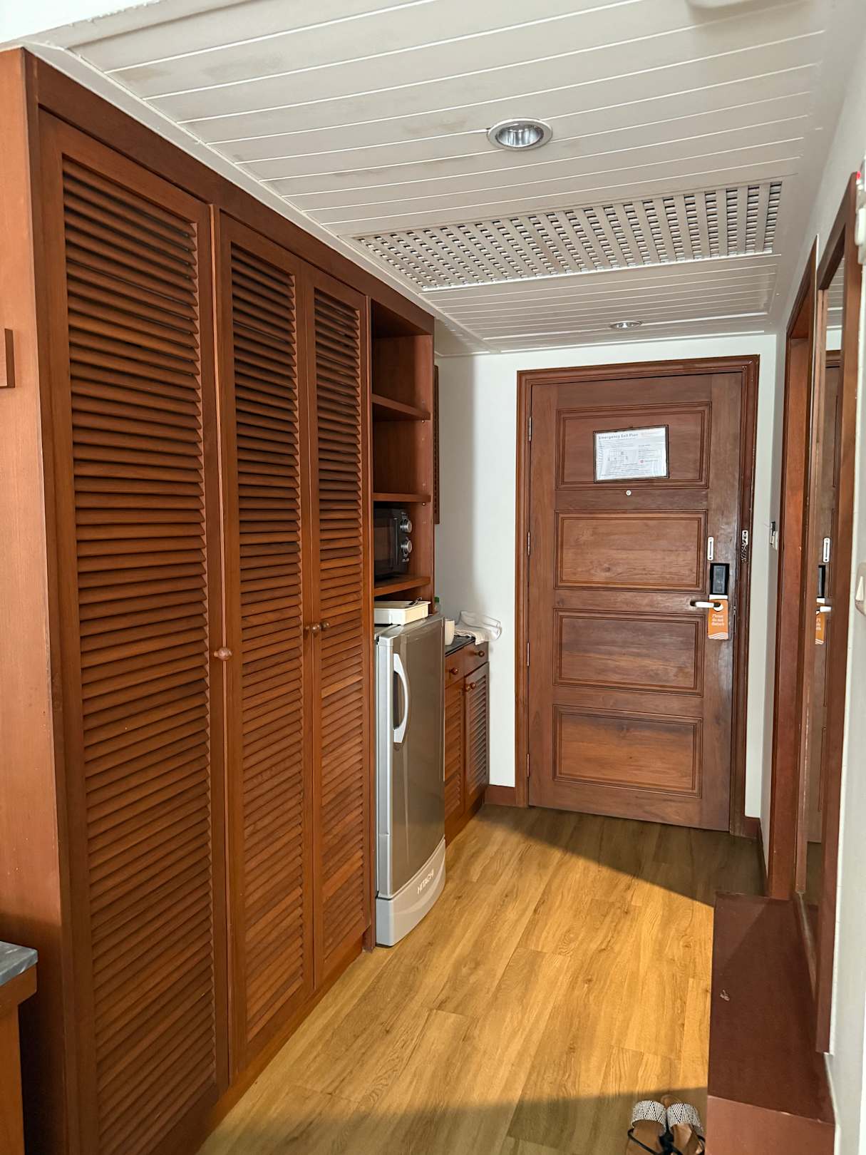 Kühlschrank, Mikrowelle, Geschirr und Abwachbecken