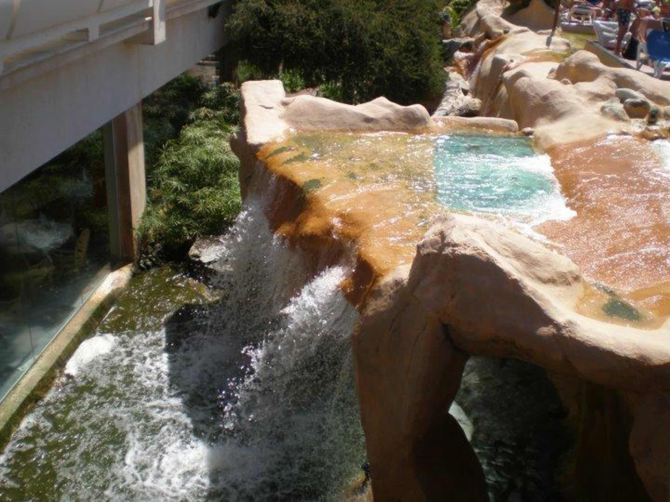 Unten links ist das Restaurant. Wenn man direkt am Fenster sitzt hat man den Wasserfall im Hintergrund. Rechts oben ist die Poolanlage. Sehr entspannend seine Lige direkt vor dem Wasserfall zu haben und das geplätscher zu hören :)