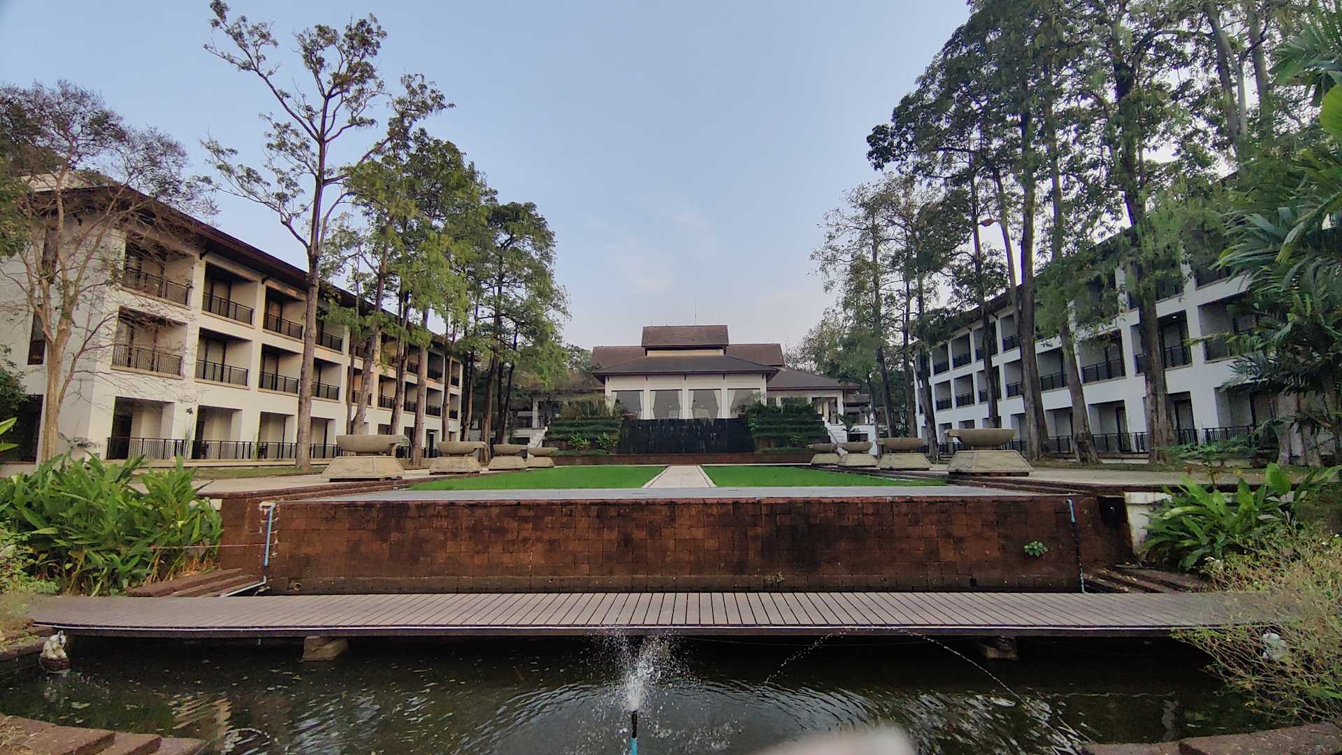 Blick vom Pool auf das Hotel.