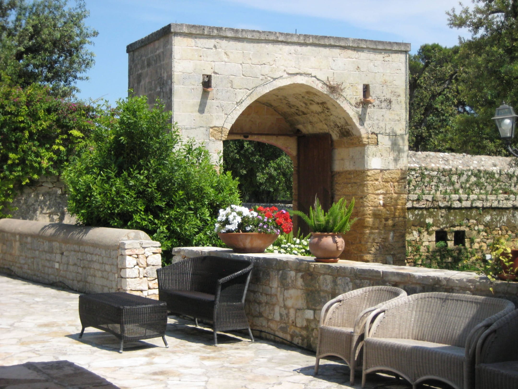 Ein großer Torbogen überspannt den Weg zum Außenbereich des Restaurants