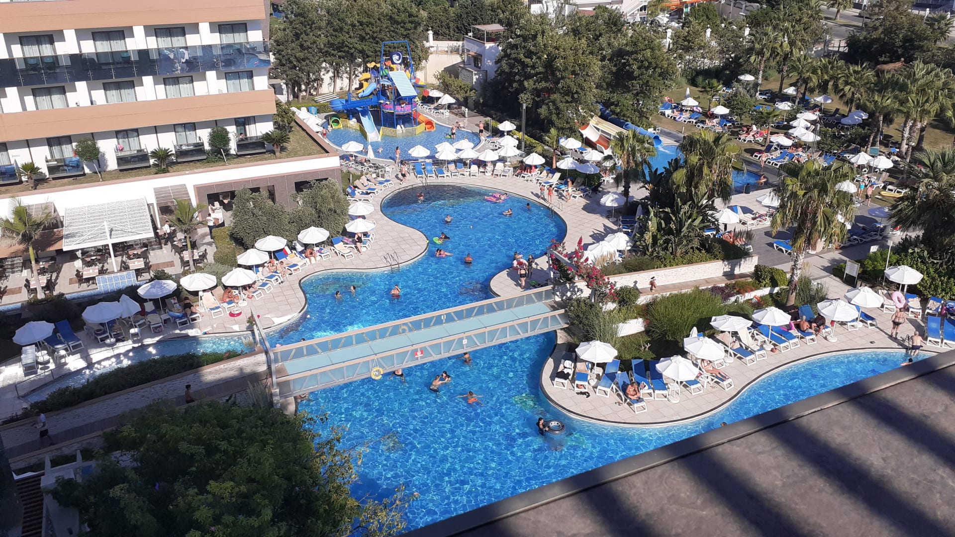 Blick von unserer Terasse auf einen Teil des Pools mit den Rutschen...
